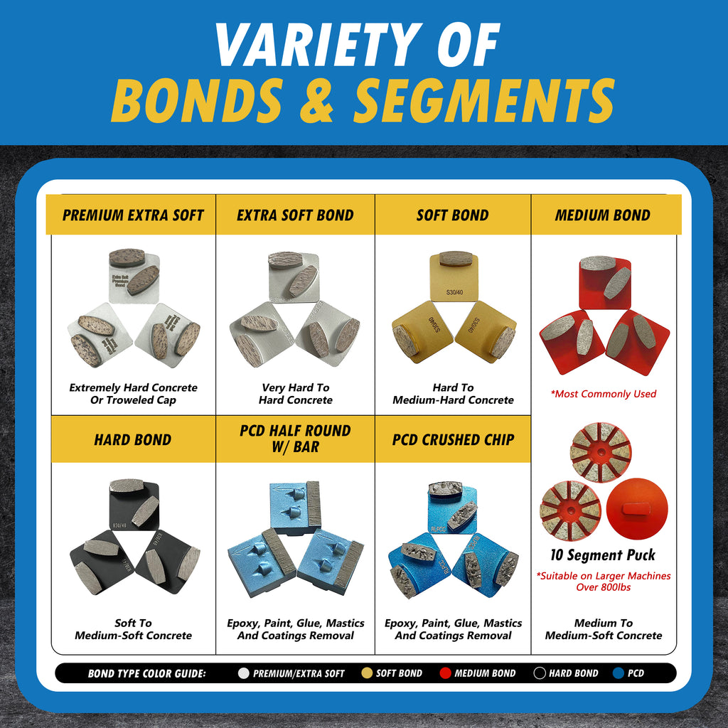 Configurations are available in 2 segments square grinding discs and 10 segments grinding pucks. Pucks offer much longer lifetime per piece and per dollar, but is only suitable on larger machines that are over 800lbs.